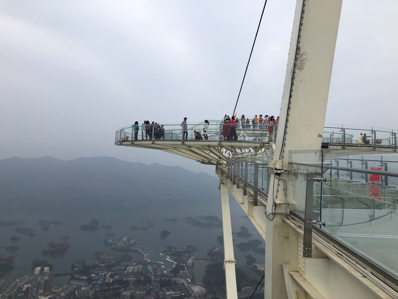天空之城位黄石阳新仙岛湖千里山山顶,俯瞰观赏仙岛湖千岛胜景的巨型乳白色钢架玻璃观景平台,又名“天空之镜”。天空之镜玻璃观景平台直径26.8米,面积为全球最大。从悬崖挑出49.5米,是美国科罗拉大峡谷平台的两倍多,空中玻璃走道长达74.6米,宽达6米。