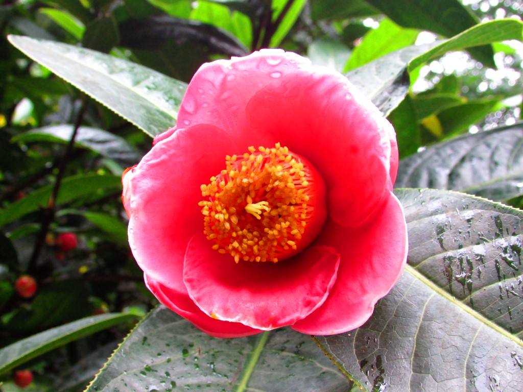 茶花花瓣呈碗形,单瓣或重瓣,有十八学士、六角大红等多种名贵品种,可采用扦插和靠接法种植。茶花因其植株形姿优美,叶浓绿而光泽,花形艳丽缤纷,而受到世界园艺界的珍视,其花语为可爱、谦逊、谨慎。