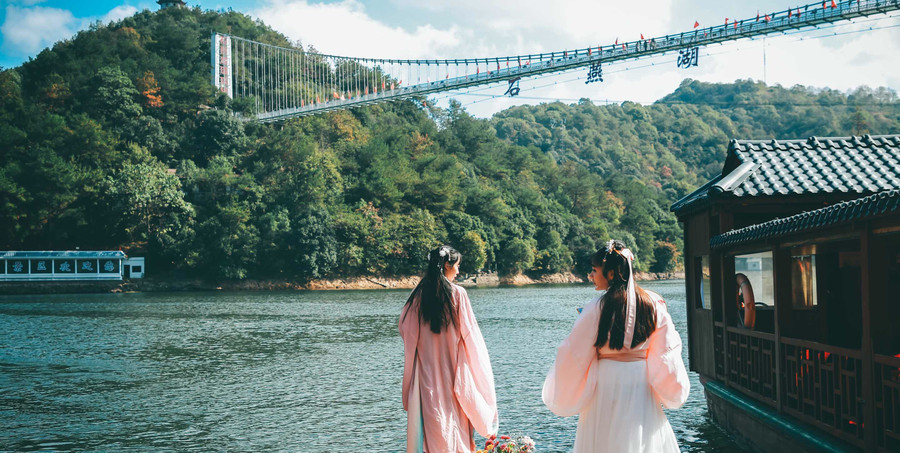 说到玻璃桥,大家能想到的词大约是险峻!刺激!石燕湖的玻璃桥给人的感觉却不同,横跨两座岛屿之间,脚下是碧湖秀水,头上的蓝天白云,低头望去,仿佛能看透天与水的亲密关系~