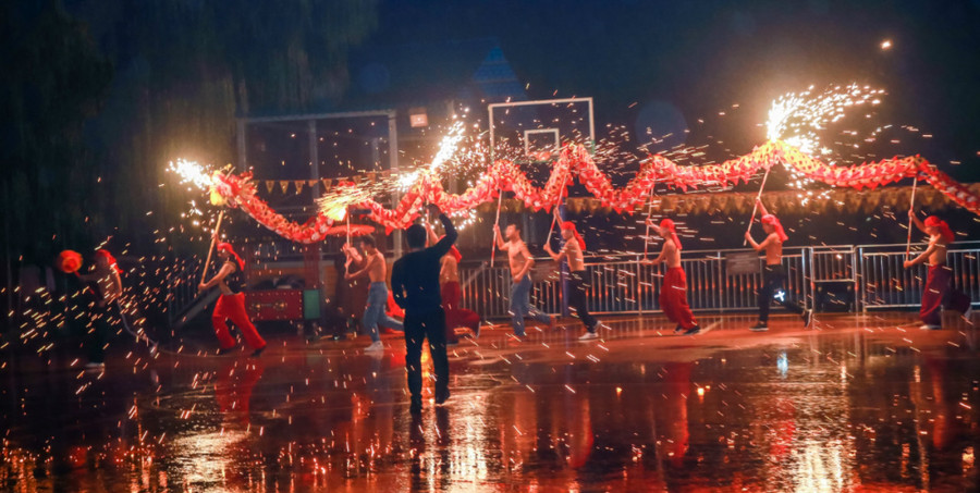 民俗歌舞表演怎么能少得了舞龙舞狮呢,浩浩荡荡的龙狮队,响彻山谷的敲锣打鼓声,给这个夜晚增加了浓浓年味,更添加了更多的吉祥与服气!
