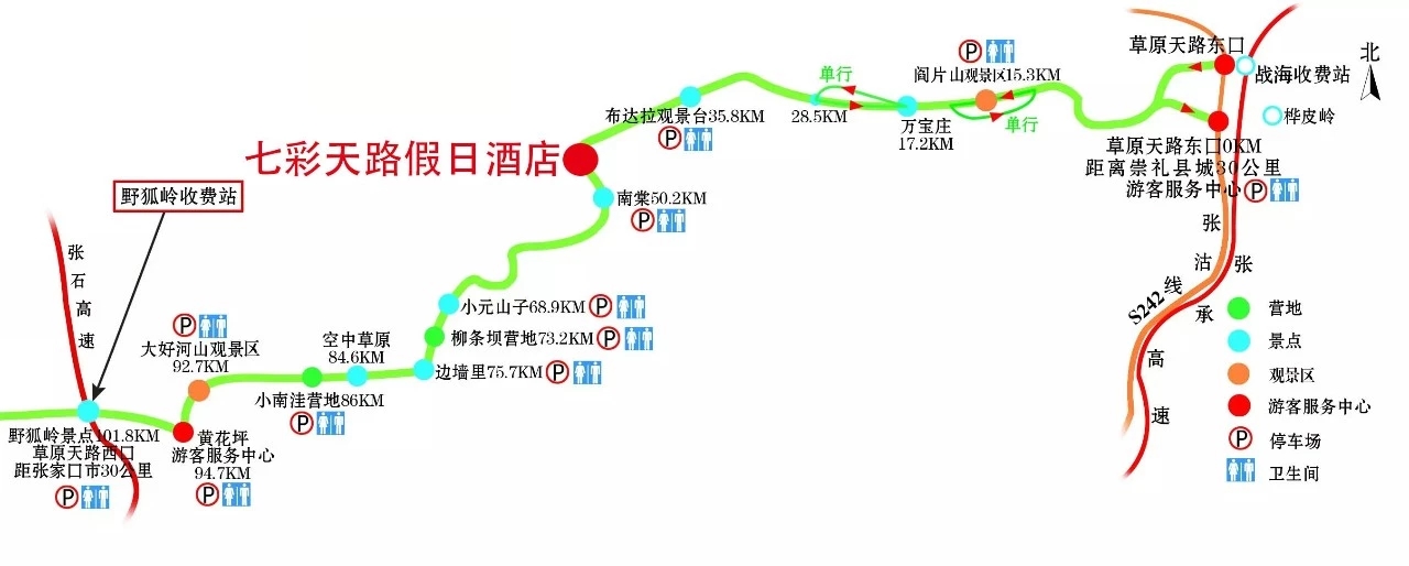 草原天路 有两个入口,分别为野狐岭入口和桦皮岭入口,同时,这也是两个出口。具体从哪个入口进,要依据每个人自己的旅游路线而定。