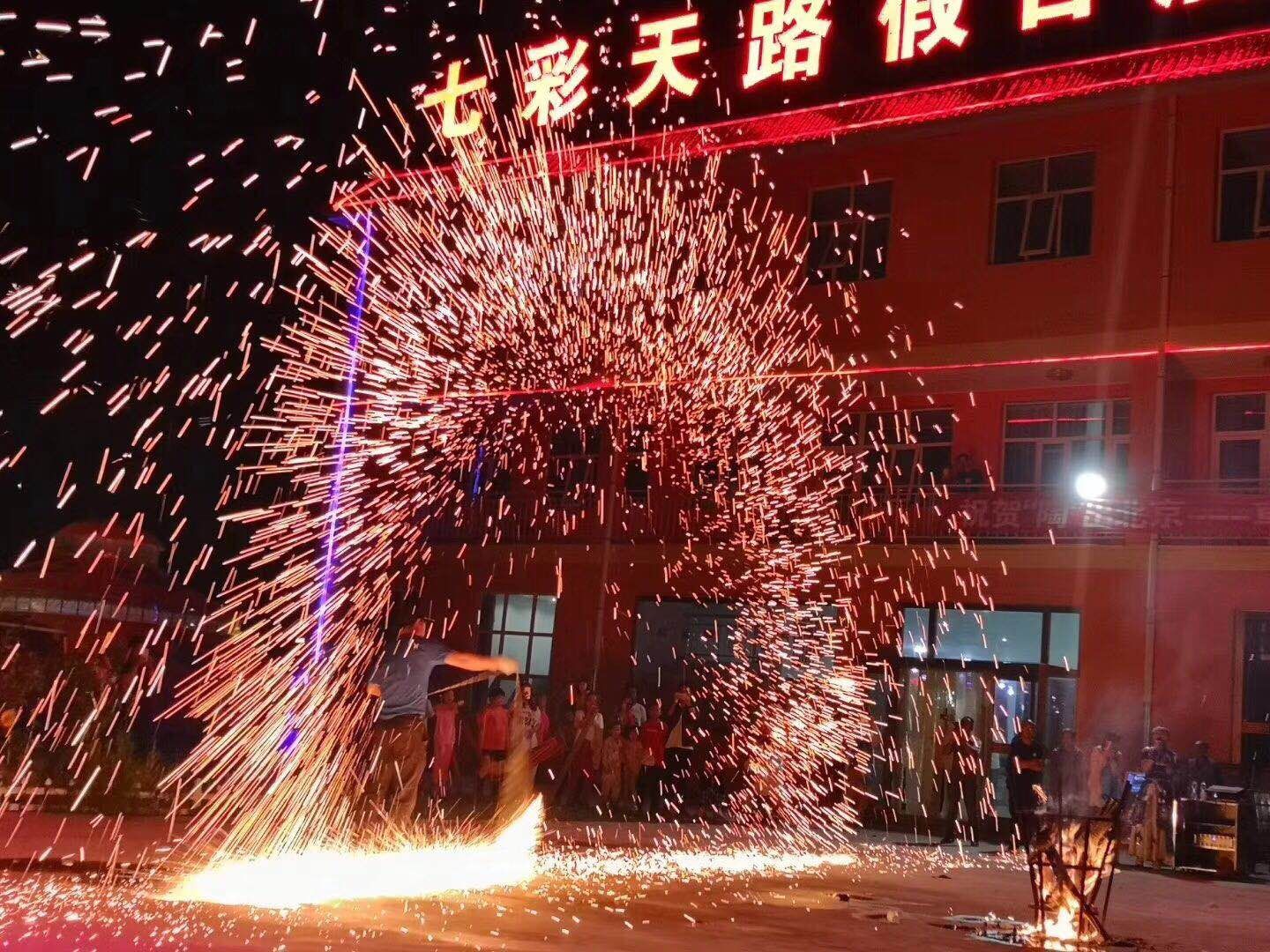 七彩假日酒店后院有秋千和吊床,如果想多待一天,呼吸下新鲜空气也不错呀。到了晚上呢,则有篝火晚会,大家一起跳舞看烟花,有人表演打树花,也是美的不要不要哒,都把孩子们看的惊呆了,我家宝宝指着火花对我说:“妈妈,火,火……”哈哈。