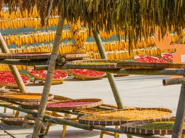 心灵手巧的晒秋人家,把眺窗当做画板,将支架用作画笔,他们以粮食作画,绘制出了中国诗意的秋天。日出山头,晨曦映照,家家户户便开始支架晒物,站在屋顶,放眼望去,整个村庄就是一个晒簟的世界