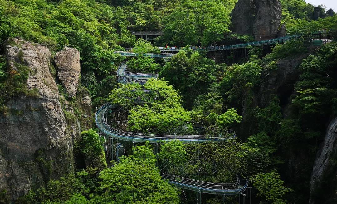 九曲十八弯、360°回转造型设计的森林高空玻璃漂流,弯道一个接一个,仿佛体验“浪尖过山车”