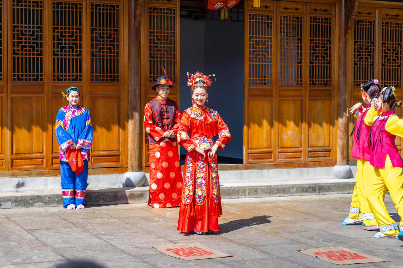 整个表演有福袋舞、穿越十里红妆、入五福门、拜天地、拜高堂、掀盖头、神树祈福等,将真实再现中华传统文化中敬天、敬地、敬人的理念,以及对“孝道”作为核心内容的尊敬,也充分体现了当地人对“千年古樟、千年神树”的敬畏之心,从神树周边哪些层层叠叠的红丝带,足以证明人们对神树的崇拜