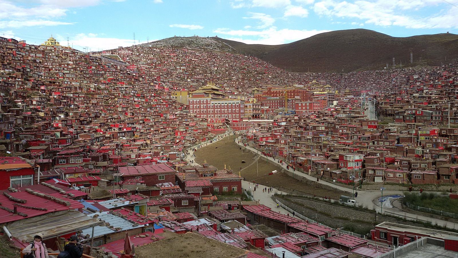简称为色达佛学院,在色达生活的藏族喇嘛有一万多,可以说是世界上最大的佛学院。每遇有佛事活动,人数还会增加,最多时可达4万多人。这里的僧舍很壮观,如果是初次到色达,其庞大的阵势往往会让来者目瞪口呆。连绵数公里的山谷布满了密密麻麻的小木棚屋,这便是成千上万的喇嘛和尼姑们的宿舍,谷底和山梁上分布着几座寺庙和佛堂,身披绛红色僧袍的喇嘛和尼姑来来往往,充满浓郁的佛教气氛。