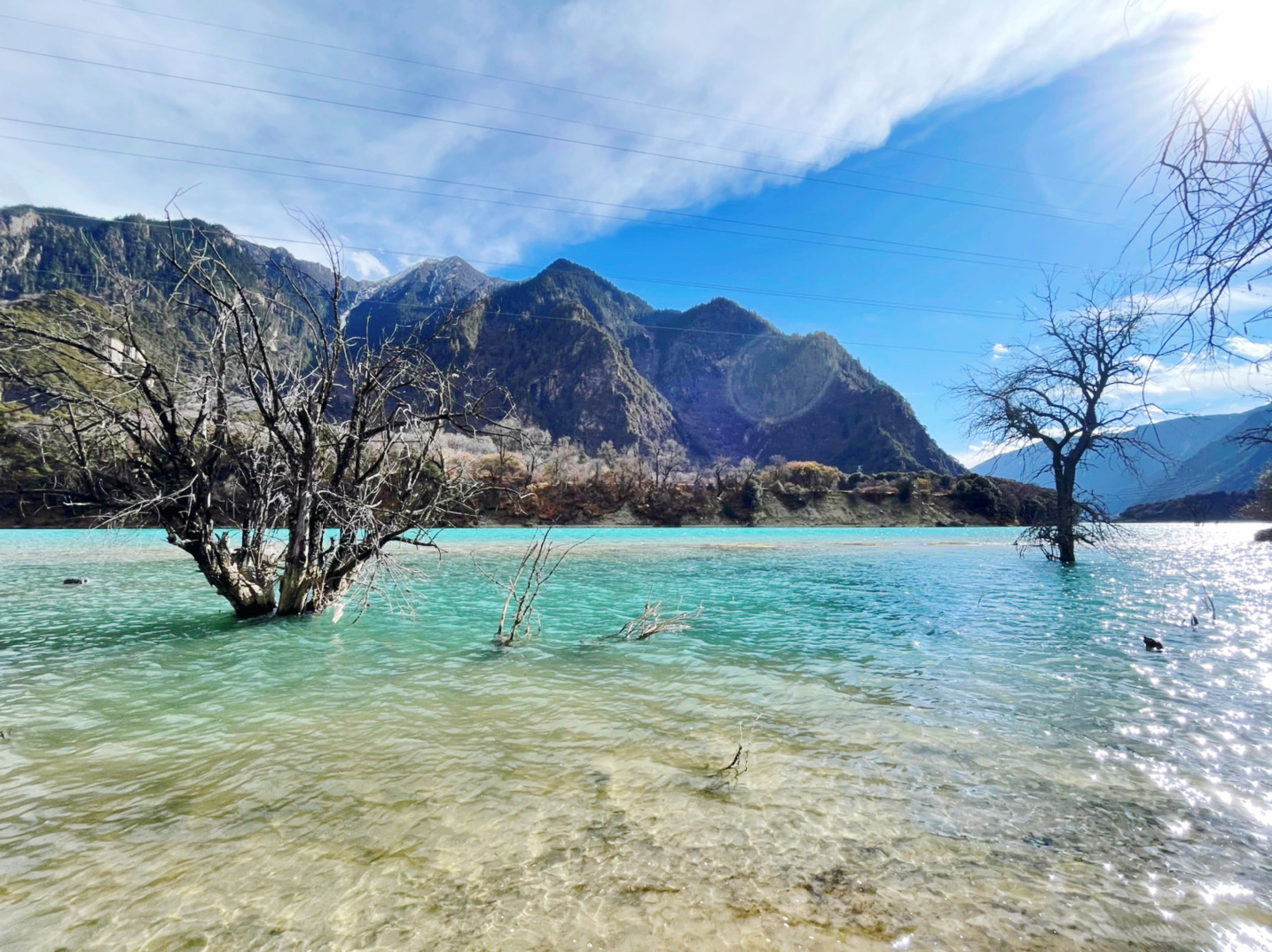 深冬的巴松措,仅剩下蓝与白。蓝色的湖水倒影出树的万般风姿,白色的雪里成了南归的黑颈鹤栖息觅食的停留地。从高处远观,湖水碧绿如翠,四周青山如黛,顶峰积雪不化。湖心岛犹如一颗宝石般镶嵌在碧绿湖水中,相拥着朵朵白云,宁静薄媚而大气。