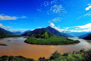 一.万里长江第一湾奔腾的金沙江水虽然很急,但由于江面宽阔,江水反倒变得很平缓,如同一条碧绿丝带环绕整座大山,就连江中的沙丘也与江