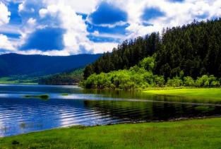 1.属都湖春夏季节百花盛开,湖畔四周一片片杜鹃花丛映红整个湖面,各种野花繁星似地贴着地面开放着。湖岸边,那绿色牧场炊烟袅袅,牛铃声声