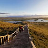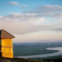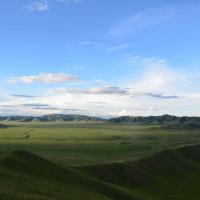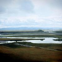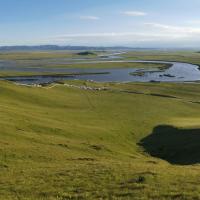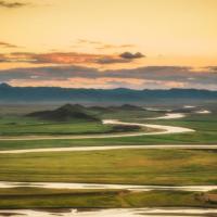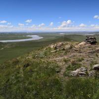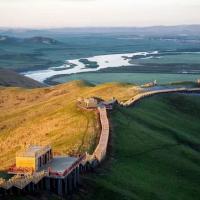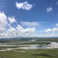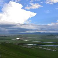 唐克有观光车到九曲第一湾景区,景区有木栈道直达黄河边,也有自动扶梯直上山顶观景台。在观景台上可以清楚地看见黄河S形九曲,像一条玉带镶嵌在碧绿的湿地草原上,蒙古包零星地散落其中,兰天白云,胜似画卷,令人心忋神旷。
