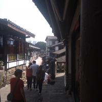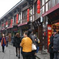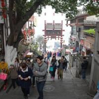 午饭我们专程前往较远的著名码头古镇——磁器口,就是冲着那里名声在外的美食、“三宝”之一的“毛血旺”去的,其余两宝是香脆的椒盐花生和小麻花,其中一家麻花店门外排了长长的人龙,估计是味道最好的。街道两旁是低矮、斑驳的砖木老房子,尽头是直抵江边的