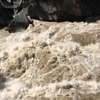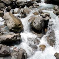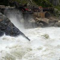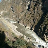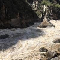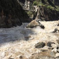 虎跳峡景区的入口就在公路旁边,站在入口处,发现山高谷深,雄奇险峻。沿着峡谷边上的石阶小道,一路向下直至谷底,腿肚子有点发抖。一路上耳边充满巨大的水声,走近一看,却是金沙江中的一块大石在上游流来的江水冲击下,发出的犹如飞机发动机的轰鸣。