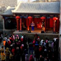 正月天气十分冷,暖泉古镇街道中间伫立着造型古朴的铁炉供游人取暖,非常贴心。至主道路尽头,又穿过一个城楼门洞,进入一小院内,甚是热闹,院中有一戏台,正演出当地戏曲,台下聚集很多观众观赏。登上城墙,眺望四方,立刻发觉有这样一座城的护卫,给一方百
