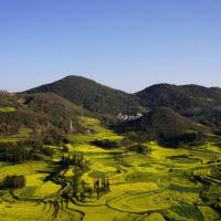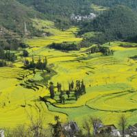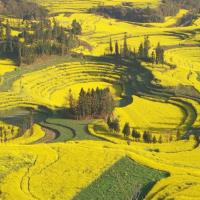 螺丝田位于罗平城的西北,这里的油菜花以同心图案梯田的形式种植,远看仿佛螺丝上的纹路,因而得名。罗平在二月中旬即迎来油菜花海,时间居全国最早。