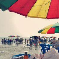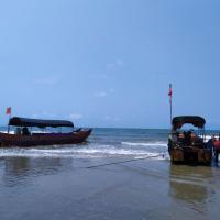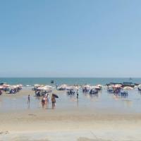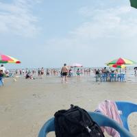金滩非常适合开车去,从东兴市开车过去40多分钟,好像也有公交车。沙滩附近吃喝泳具全都有卖的,价格不清楚,我们都是自带的泳具,租伞100元。更换衣服加淋浴5元。海滩是黄色的沙子,超级细。退潮的时候还在沙滩上捡到了很多小螃蟹。
