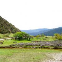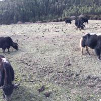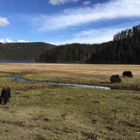 普达措国家森林公园景色真是怡人,两边山坡中间是低谷,再开阔点便是牧场了,涓涓溪流肆意流淌,溪流两边长满了高山寒柳。它与平原的垂柳不同,枝条和叶子是向上生长,整个树冠略呈半圆,像是人工修剪过一样,非常整齐。有水处便有青草,这个季节大多数牛羊也
