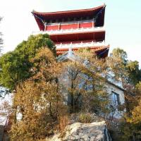 南五台山距西安三十公里左右,在五台镇,门票40元每人,车可以上山,山路约十公里,路较窄。山上有两个停车场,都不大,沿途可以看到向阳的山坡上大片的红叶,路边也有红的黄的树林,植被很茂密。从停车场开始登山,观音台为最高峰海拔1688米,为主景区