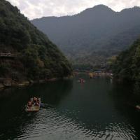 三月去九龙谷国家森林公园游玩,其中九龙谷霞客漂流,就在九龙谷景区内,沿着溪谷走到快到景区的尽头,左岸有一处堆着许多橡皮船的小木屋,就是漂流起点了。最好是雨水较多的时候去,既可以感受漂流的刺激,又可以领略沿途的风景。我8月底去的时候,溪谷里没