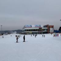 棋盘山冰雪大世界整体感觉还是不错的,买的日场票,北站顺风车过去的,没有坐那个168公交,所以早上到的时候刚刚开门,我们前面就五六个人,环境不错的,而且今天下大雪,超级漂亮。租雪具什么的都很方便合理。本人不建议请教练,我们两个人是第一次滑雪,