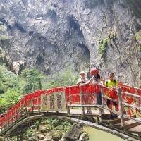 洞天仙境空气清新,环境优美,值得一去。洞里最大的特色就是多燕子,充满燕子的叫声,不时还有燕子屎从天而降了,极有可以中头奖哦!洞的上部有个迷你的超少超短玻璃栈道。水很黄还不时有生活**从洞里流出来,水位比较高,游船就停止服务了,只能走路进去,