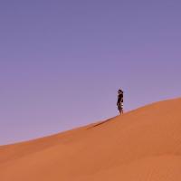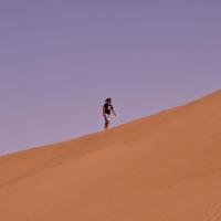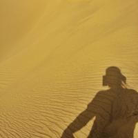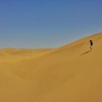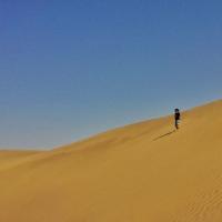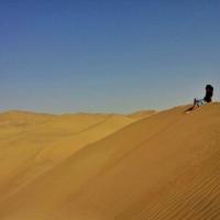 有些人认为穿越沙漠意味着征服,而我觉得穿越沙漠只是为了亲近沙漠。进入塔克拉玛干,我们的视觉、呼吸、听觉、甚至我们的味觉都是塔克拉玛干的,当身处沙漠腹地,当你全身的感官都与沙漠融为一体时,你会幻想从空中看到自己,你就是沙漠里的一粒沙,一花一世