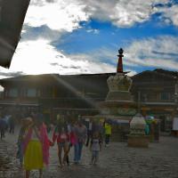 独克宗古城是香格里拉的老城区,现在开发成旅游区了,这里有很多的民居和客栈,中心区域是月光广场,广场上时常可看到一些藏族大妈喂鸽子,月光广场旁是龟山公园,登上去视野很开阔。可看到整个景区。