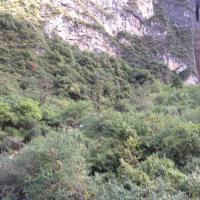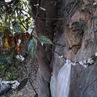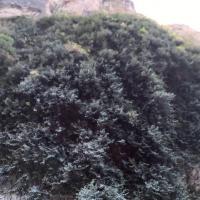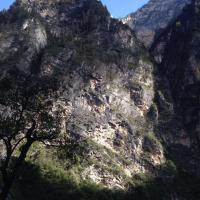 我们从通天峡景区乘车返回到巴拉格宗大峡谷入口出的服务中心。导游领着我们到附近一处峭壁前,说这是一颗有三千年树龄的菩提树。以前也听说过释迦牟尼在菩提树下成佛,但印象中没有见过真正的菩提树。今天有幸一睹真容。这棵树除了离地面大约两米左右树干与石