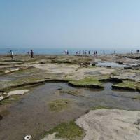 涠洲岛五彩滩在阳光的照射下特别的壮面。大片大片的火山熔岩裸露出来,特别的宽阔。许多地方虽然海水退了,但还是留下了大片大片的一洼一洼的水,在蓝天的映射下,一洼一洼的水在视线中也变成了蓝色,和裸露的岩石一起,很是迷人。