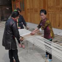 黄岗侗寨平静的过分,此起彼伏叮叮当当的敲打声,循声而至,原是在做侗布打亮,门里是一台手摇纺线机和一台手动织布机;屋旁横排着几个桶从新鲜采集的叶子到发酵成染布的颜料;偶尔路过一两个村民有在村里小水渠边洗漱的女人和下田归来背篓装着鸭子的老人;这