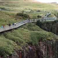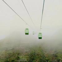 大韭菜坪景区里也有住宿,但也在山下,离景区外的住宿隔着一道大门,没有太大意思,上到山顶还需乘座观光车。观光车单边25,缆车单边40。清晨的韭菜坪气温只有18度左右,需要穿较厚的外套。观光车下来还需爬20多分钟的台阶,然后左转可以很快到玻璃栈