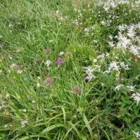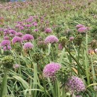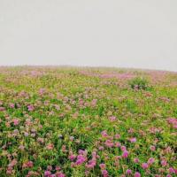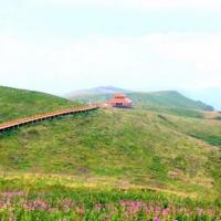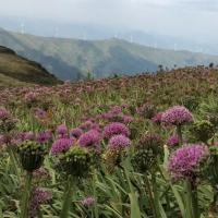大韭菜坪,可以坐索道或者观光车上去坐观光车上去,大概要多爬七百米山,山顶都是还行步道,一圈大概五公里。山顶超凉快,有许多农民烤土豆鸡蛋。其它花随时有,但韭菜花大概8月底开。