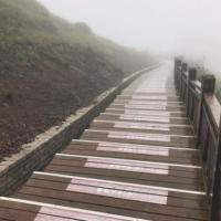 到的大韭菜坪那天下着雨,一早冒着大雨上了山顶,从观光车站到山顶一共有400多级,山顶云雾缭绕,星星点点的韭菜花慢慢的多起来,终于,我们上到山顶,云雾笼罩下的韭菜坪终于见到真容,虽然不是花期,但也让我们见识了韭菜花也有春天!
