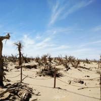 怪树林以前是一片胡杨林,经过风沙的侵蚀,胡杨林渐渐变成了朽木状的怪树林。只有在那里你才能体会胡杨林的生命顽强,三千年不死,死了三千年不倒,倒了三千年不朽。那里给你一个古战场的唏嘘不已的感觉。