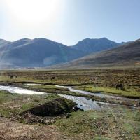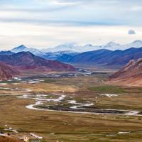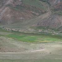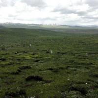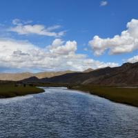邦达草原是澜沧江与怒江之间的一个宽阔平坦的山间盆地,怒江支流玉曲河在这里蜿蜒曲折地流淌,河两岸是一片片生长着草甸植物的低湿滩地和草场。因为地处藏东,雨水较西藏中西部稍多,加上河流的灌溉,牧草相对也就较茂盛,一路上可见成群的牛羊在草滩上悠闲地