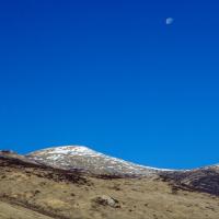 在邦达草原上看着朝阳升起来了,马群在享用美味的青草。雪山草地白马,圆月孤悬蓝天,好诗意的场景。