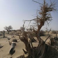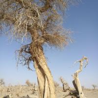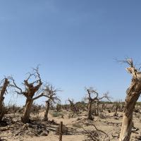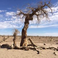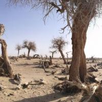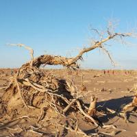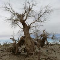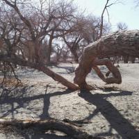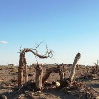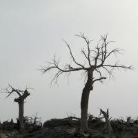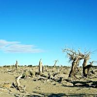 额济纳胡杨林由于自然因素,大片枯死的胡杨树东倒西歪,神态各异,其奇异的造型给人以死一般的沉默和童话世界中的仙境奇观