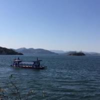 今天游红枫湖,天公便是使出本事,让我们领略不同天光下湖水的不同,水天相接色彩的不同,还有红的游船,绿的小岛在不同光线色彩的不同。上午到达景区时,空中似乎还飘着小雨,让我不由有一丝雨中看灰蒙蒙一片水面的担心。进入景区,云层已经由灰黑变为厚棉絮
