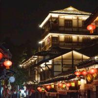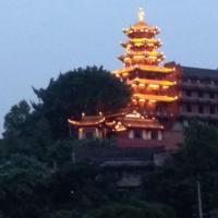 重庆磁器口宝轮寺是一个上千年很有名气的明朝时候的古寺,又经历了修善,里面的建筑物很有特色。不巧的事,该寺关门较早,我去迟了,未能入寺内参观,但在傍晚夜色中看见了该寺内小山上的塔有灯光大开,远观还是很壮观的。
