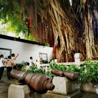 林则徐纪念馆在福州三坊七巷附近,免费参观,第一天到福州就来参观了。一进门就是一个厅堂,种植一棵巨大的榕树,得二个人合抱,从树枝上垂下很多气生根,旁边立着三块石碑。对面摆着几架大炮。再从旁边的小门进入,就是一个大花园,有假山,鱼塘,亭台,有同