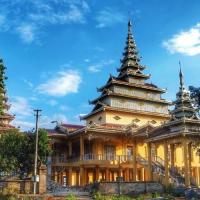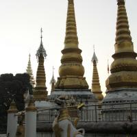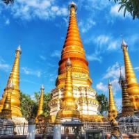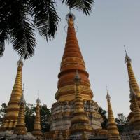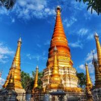 姐勒金塔,傣语称“广母贺卯”,意为在坝子马头的塔,它距云南瑞丽市东北5公里,是瑞丽最古老的佛教建筑、佛事活动场所和旅游景点。姐勒金塔始建于17世纪,由17座塔组成的群塔,塔身贴满金色磁砖,除主塔外,四周环绕着16座小塔,塔身均涂金粉,金碧辉煌,如众星拱月,雄伟壮丽。 塔基用长方青石建成,塔群为钢混结构,主塔高39.5米,塔身为正八棱形,呈圆锥体,贴满金色瓷砖,顶尖轩有电化铝制成的宝伞、风标,系着上百只风铃。远远望去,金光耀眼的金塔,掩映在大青树群之中,微风吹来,铃声叮当悦耳,反映出傣族工匠数百年前,独具民族特色的建筑构思和艺术成就。此塔是东南亚的著名佛塔之一,旁有佛寺供奉。每年的泼水节,都要举行3天隆重的佛会,非常热闹。