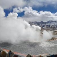 海拔最高的温泉——羊八井地热温泉。羊八井最美的时候是每天的清晨,由于空气比较冷,羊八井地热田一带总弥漫着白色雾气,地热田产生的巨大蒸汽团从湖面冒起,如人间仙境。如果运气好,碰上热水井喷发,更可一睹沸腾的温泉由泉眼直冲云霄的场面,十分壮丽美观