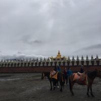 塔公草原的草变成了金黄色,倒是另外一番光景。人依旧不少,去山顶需要骑马过去,不少藏民牵着自家的马匹四处揽客,马一边走一边拉,到处都是马粪,要低头看着路走。在草原上,抬头就可以看到雪山,景观良好。