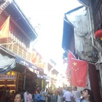 屯溪老街国庆的时候四处国旗飘扬!五星红旗飘扬的老街分外美丽!喜庆的日子里只把酒对饮恭祝祖国繁荣昌盛!老街兴旺!美食街在改造中!但是生意还是这么的好!国人都很开心。