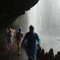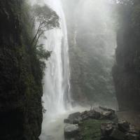 我去三峡大瀑布的这天是下雨的,四周绿叶青翠欲滴,细雨徐徐,轻风飘摇,漫步溪涧栈道,耳旁鸣鸣流水激荡,别有一番风味;大瀑布处更是欢乐与悲惨共存,即使穿一体的雨衣和鞋套,瀑下风大,裤子还是会湿,可以尝试穿分体的或者把裤脚卷上去;总体来说,三峡大