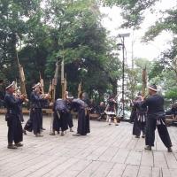 大约一小时车程,到达岜沙苗寨。虽然“最后一个枪手部落”的名称听起来很原始,但是岜沙的售票厅还是比较现代豪华的。在售票大厅需要等待进入寨子的大巴。随着鸣枪仪式,表演结束了。表演者们都扛着芦笙、长枪返回村寨休息。我们也随着他们的队伍,走进苗寨。