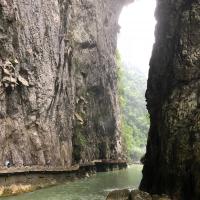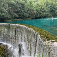大七孔景区比小七孔要小很多,沿梦塘河两岸栈道行走于峡谷间,两个小时足够了。它最大的靓点在于天然形成的天生桥,像一座巨大的单孔桥横跨梦塘河之上,又仿佛是一道凯旋门。穿越这道门,如入人间天堂,碧蓝碧蓝的水,宁静幽雅。
