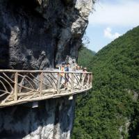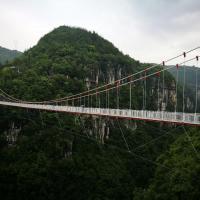 石门河是个不错的景区,自然风光,比较大,全程不走回头路,进景区就是玻璃桥,因为在其它地方走过所以就定的不走玻璃桥的票,如果走的话就少走一段上山的路,稍微轻松一点,全程最累的是开始和最后一段上坡路,中间是在山中间的悬挂路上行走,最后的直达电梯
