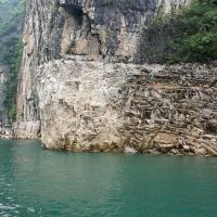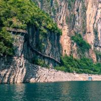 巫山小三峡,悬崖边建有仿古栈道,老栈道已经沉没到水底几十米下,栈道有全透明琉璃的悬崖体验。小三峡坐船游还是比较合适的,水波不惊的江面很难让我回忆起十年前的样子。小小三峡的小船也很有特色,船夫一个月只有政府补助的1000块收入,有可能的话买个