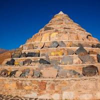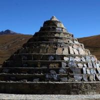 尊胜塔林在即将到达稻城的路上,共五层,最高层中央为一个高大的白塔,周围排列四层小白塔,从上到下每层依次有15、23、31、39座塔,共108座小白塔,很是壮观。
