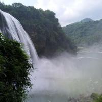 黄果树瀑布既秀丽又壮观,去的时候正好是水量充沛的时候,瀑布奔流而下,声势浩大,水流湍急,越是靠得近,水雾也越大,感觉像下小雨一样,需要打伞或穿雨衣。第一次来的旅客,去瀑布的电梯票不用买(老人与孩子除外),可买回程的电梯票。